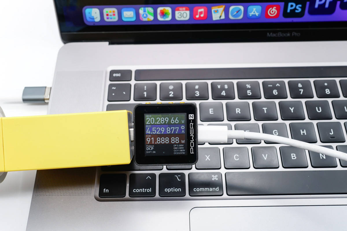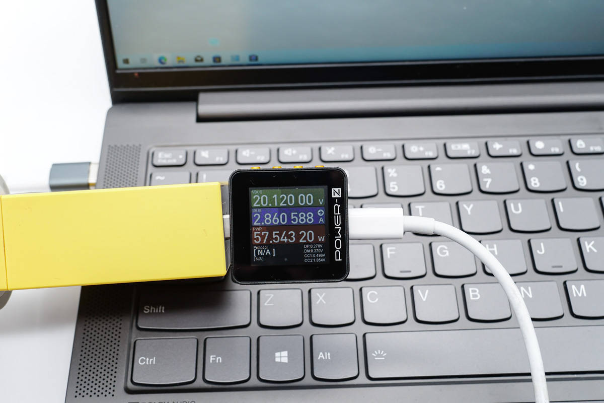 Primeiro de tudo, vamos olhar para o carregamento rápido. Use um carregador de 100 W com um adaptador magnético de cabeça reta para carregar o laptop com uma potência de 20,12 V 2.86A 57,54 W.