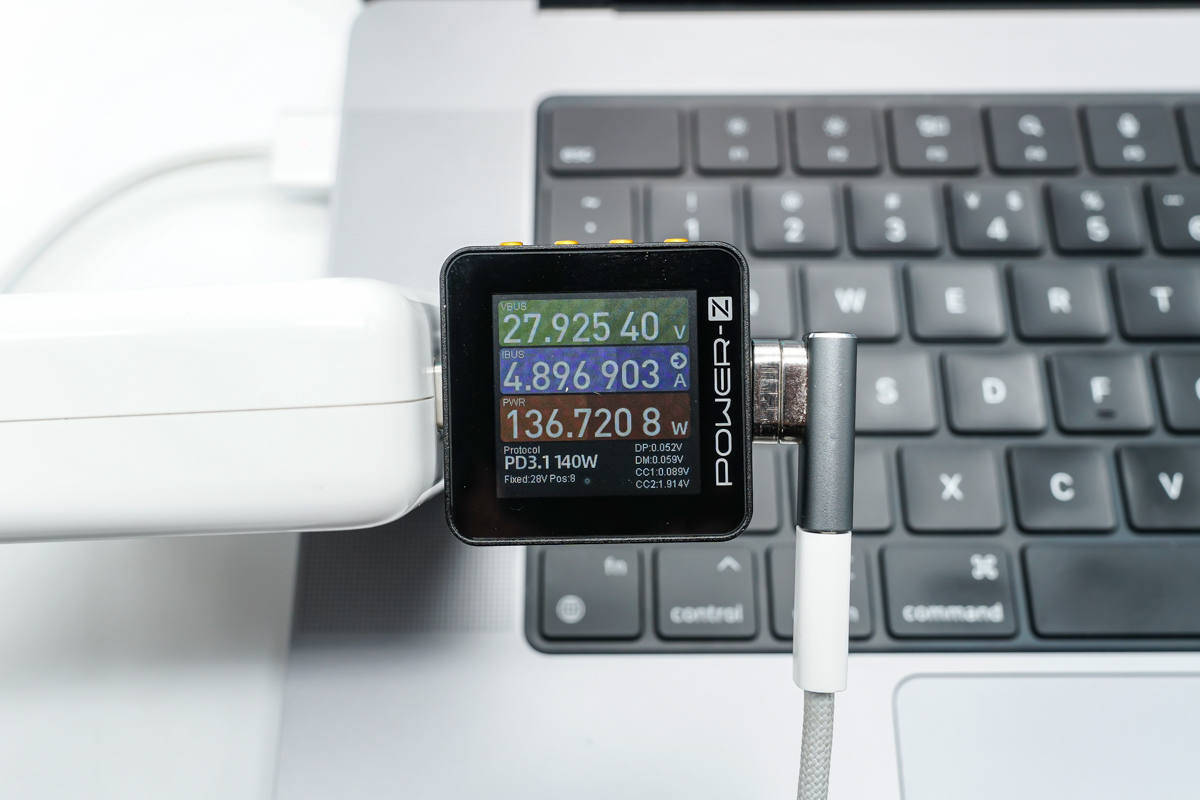 Ele também suporta carregamento rápido de 140 W e o adaptador está conectado ao carregador de nitreto de gálio de 140 W da Apple e ao cabo de carregamento rápido MagSafe 3. Neste momento, a tensão de carregamento é de 28V e a potência é de 135,72W.