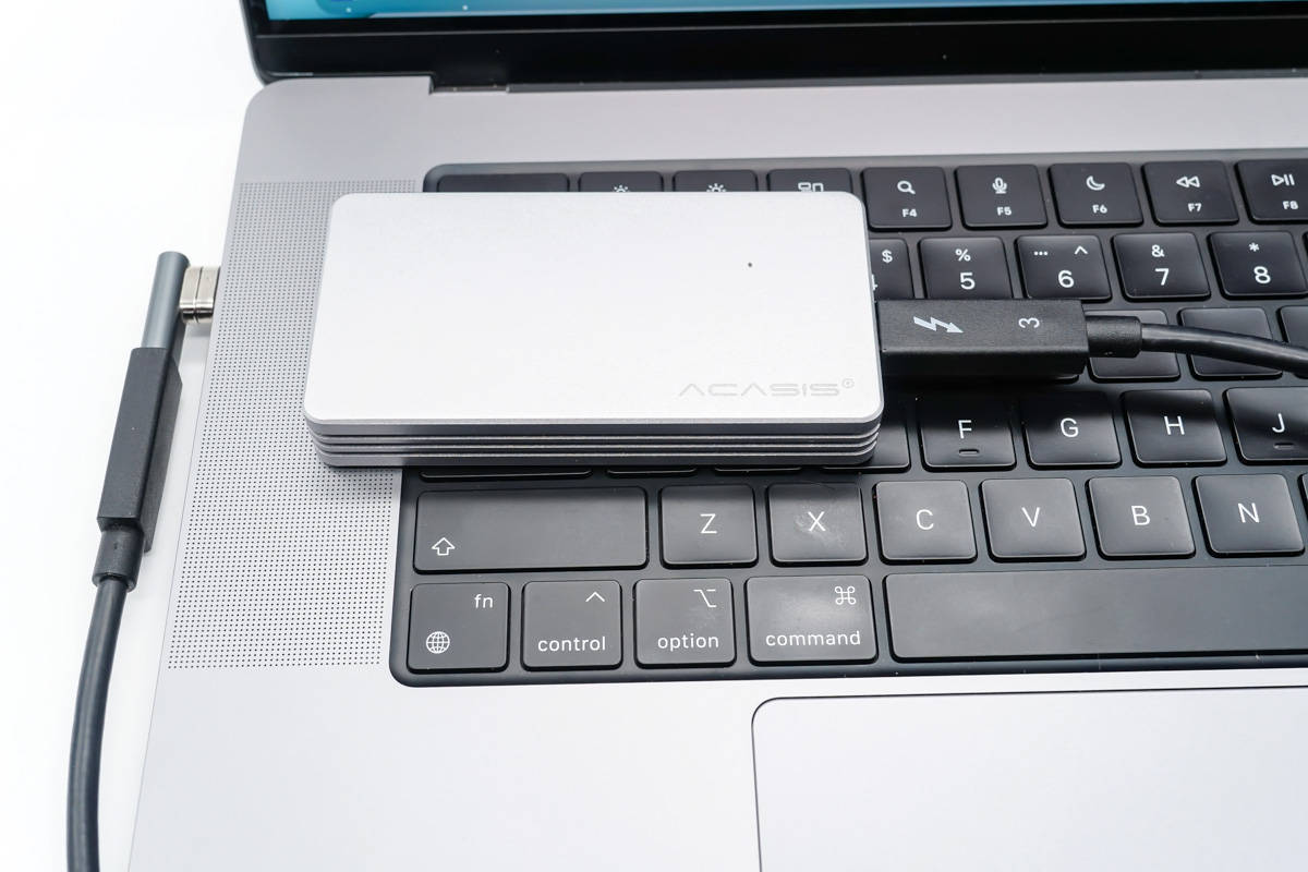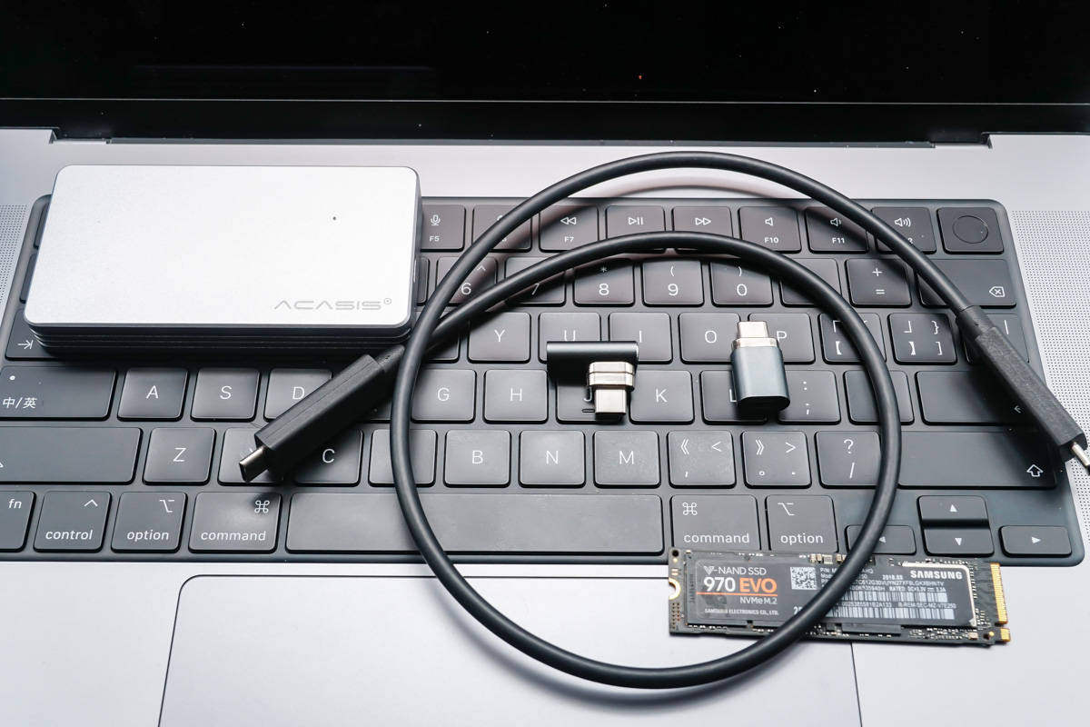 Em seguida, vamos dar uma olhada no teste de transmissão de dados. As ferramentas usadas são unidade de estado sólido Samsung 970 EVO, caixa de disco rígido Thunderbolt 3, cabo de dados Thunderbolt 3 e dois adaptadores.