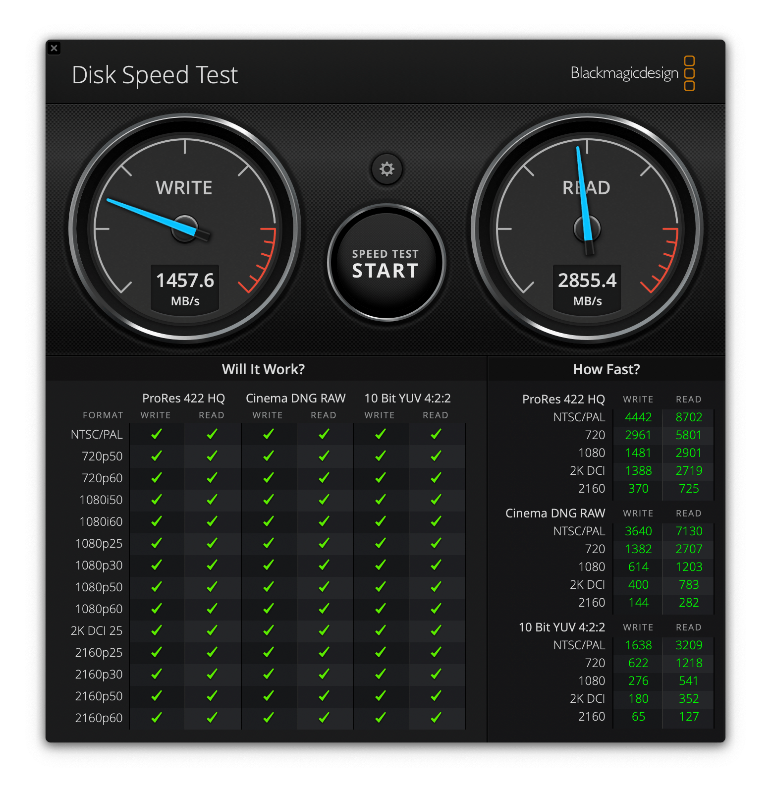 Usando o Disk Speed Test no MacBook Pro para testar a velocidade de transferência, a velocidade de gravação medida é de 1457,6 MB/s e a velocidade de leitura é de 2855,4 MB/s. (A velocidade real de gravação do disco rígido Samsung X5 aqui é de 1700 MB/s e a velocidade de leitura é de 2400 MB/s)